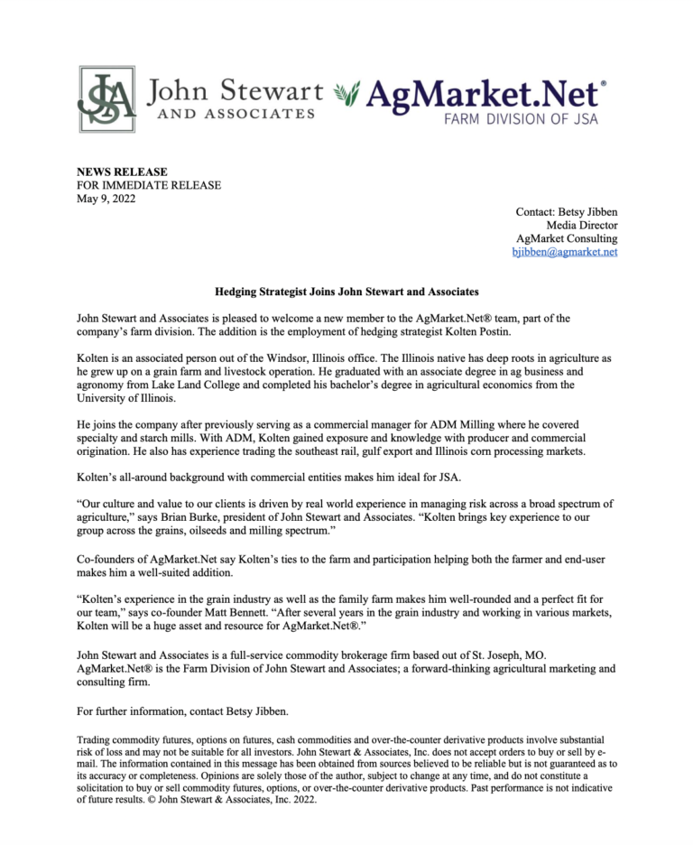 John Stewart and Associates is pleased to welcome a new member to the AgMarket.Net® team, part of the company’s farm division. The addition is the employment of hedging strategist Kolten Postin.